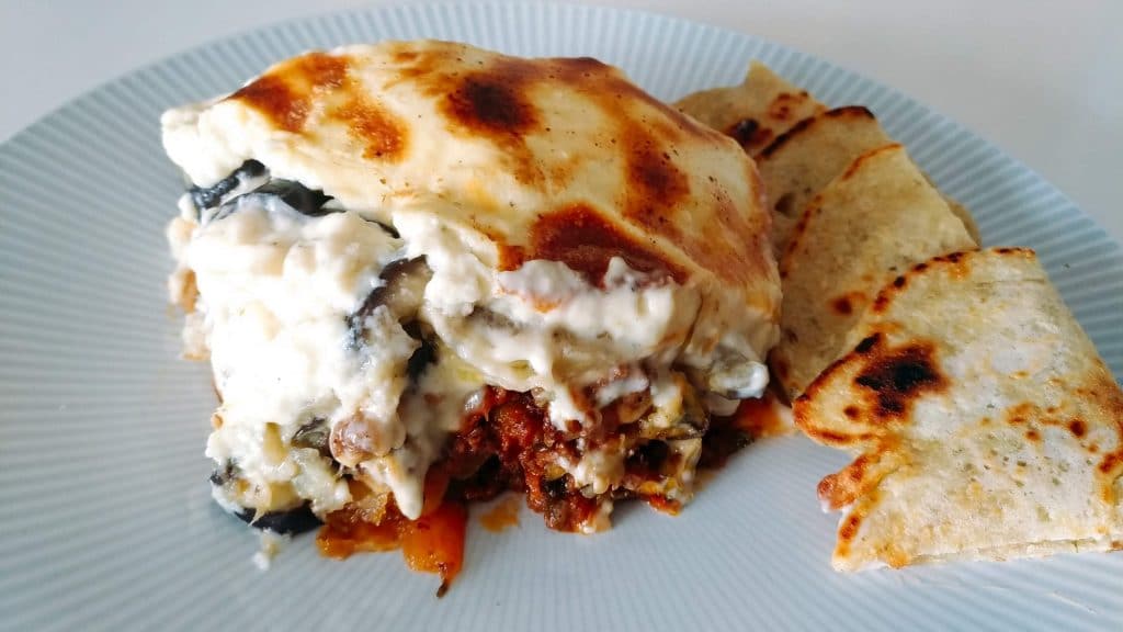 - PASO 7 Armar nuestra Musaka. Sobre la capa de papas cocidas y doradas, poner una capa de sofrito, luego una capa de berenjenas, luego una capa de queso, otra capa de sofrito y terminamos con una capa de berenjenas. Verter toda la salsa bechamel al molde o sartén. Llevar al horno por 30-40 Minutos o hasta que esté completamente dorado. Dejar reposar y servir. Acompañar con pan fresco o ensalada de rúcula.