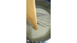- PASO 6 Preparar la salsa bechamel. Batimos los dos huevos con la ralladura y zumo de limón y reservamos. Derretir a fuego medio la mantequilla y calentar la leche. Una vez la mantequilla esté derretida, añadir la harina de trigo y la hoja de laurel, mezclar hasta formar una pasta. Inmediatamente añadir de a poco la leche tibia y mezclar constantemente. Una vez rompa hervor, bajar del fuego y añadir los huevos batidos, y mezclar vigorosamente.