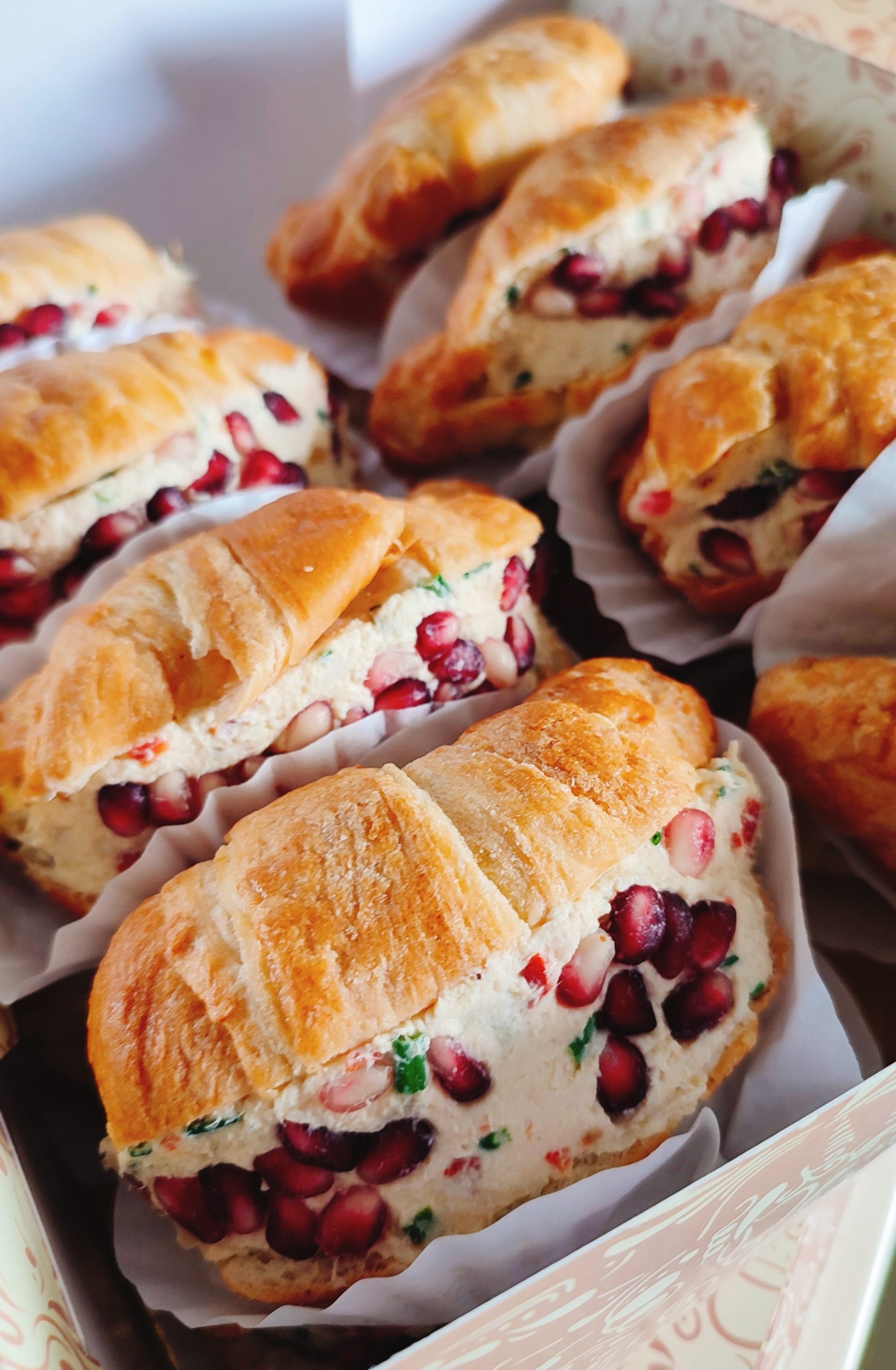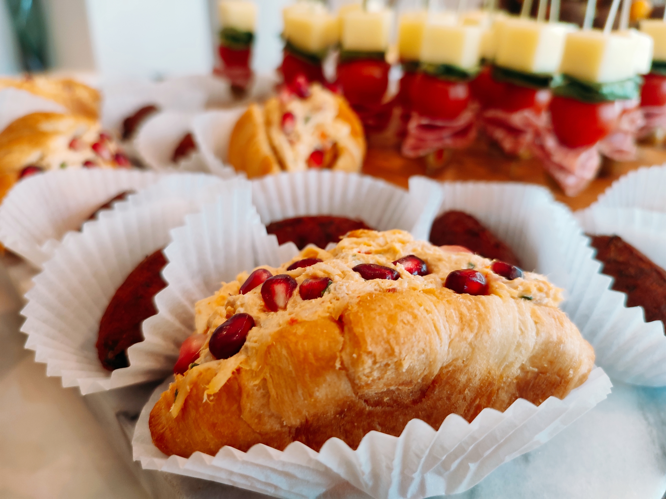 Delicioso mini croissant de mantequilla con un suave relleno de pollo con queso crema, sofrito y cebollín, decorado con algo de fruta disponible. Cantidad Mínima 18 unds