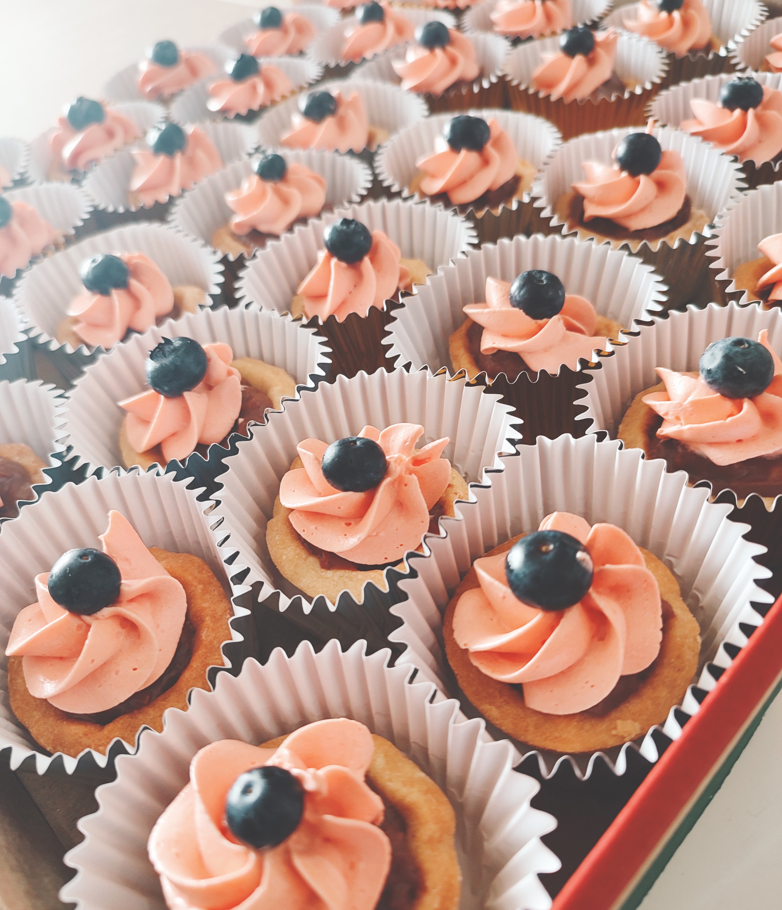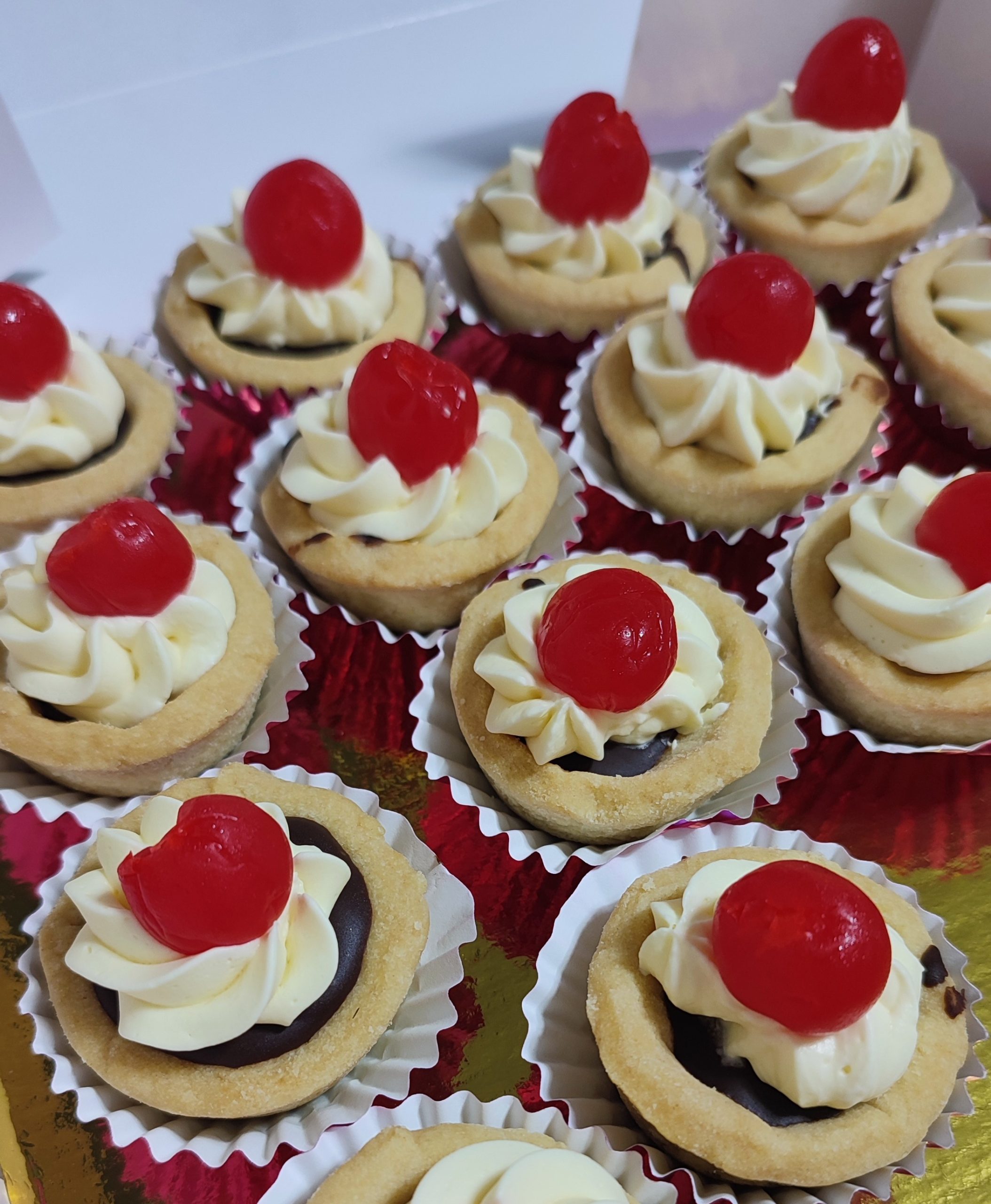 Deliciosa crema de chocolate en una mini tartaleta, decorada con crema suave (el color de la crema se puede personalizar) y un toque de fruta disponible. Un pasaboca irresistible y hermoso para tus fiestas. Mínimo 16 unds